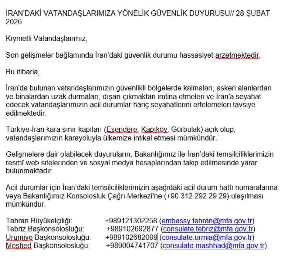 İran'daki Vatandaşlarımıza Yönelik Güvenlik Duyurusu//28 Şubat 2026